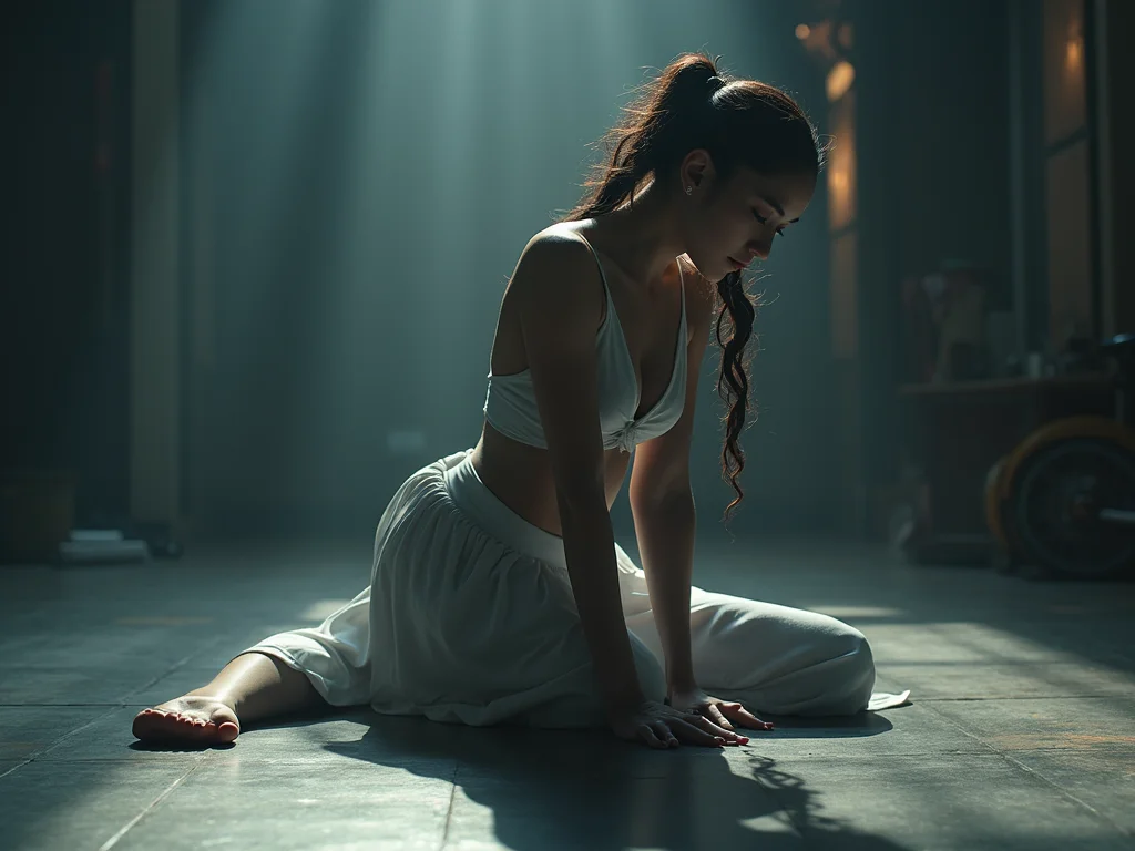 Contorcionista em pose de ‘anel’ com braços e pernas formando um círculo, em um espaço amplo com piso de madeira e luz difusa.