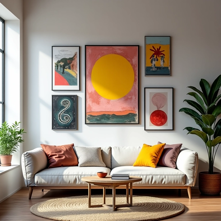 A harmonia das cores e temas nos quadros pode transformar a atmosfera da sua sala de estar.