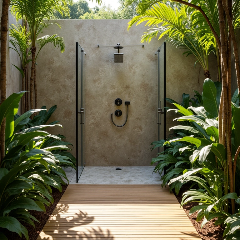 Ducha externa cercada por plantas tropicais vibrantes e exuberantes.