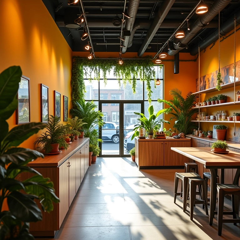 Iluminação estratégica de loja com luminárias modernas e ambiente acolhedor.