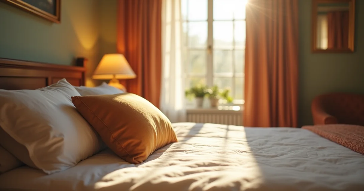 Quarto de pousada com cama queen-size, roupa de cama branca em algodão egípcio, duas mesas de cabeceira de madeira clara com luminárias de abajur em tom bege e parede principal em tom pastel suave.