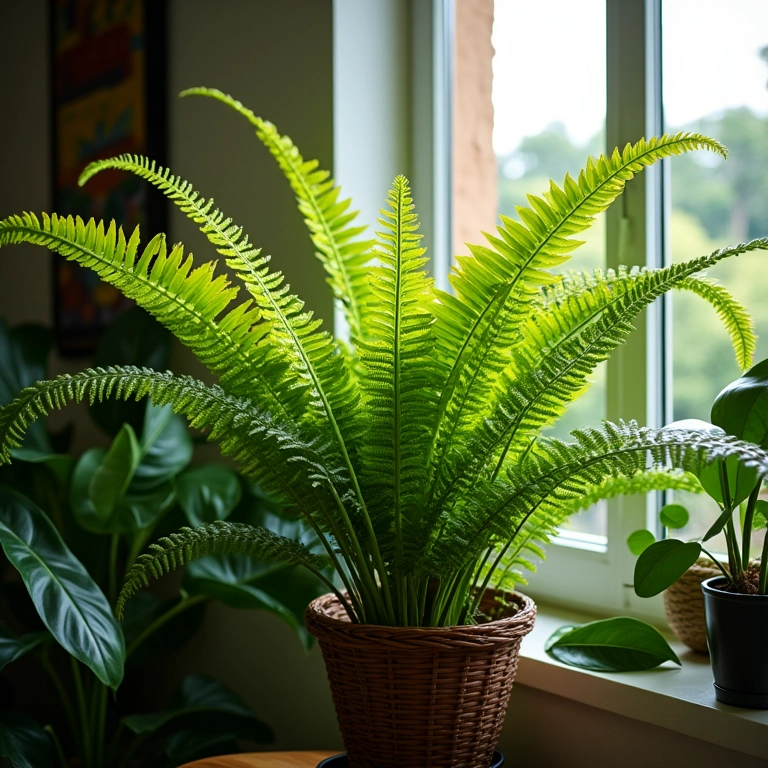 Uma samambaia de metro exuberante desfruta da luz indireta do sol, exibindo sua beleza e vitalidade em um lar acolhedor.