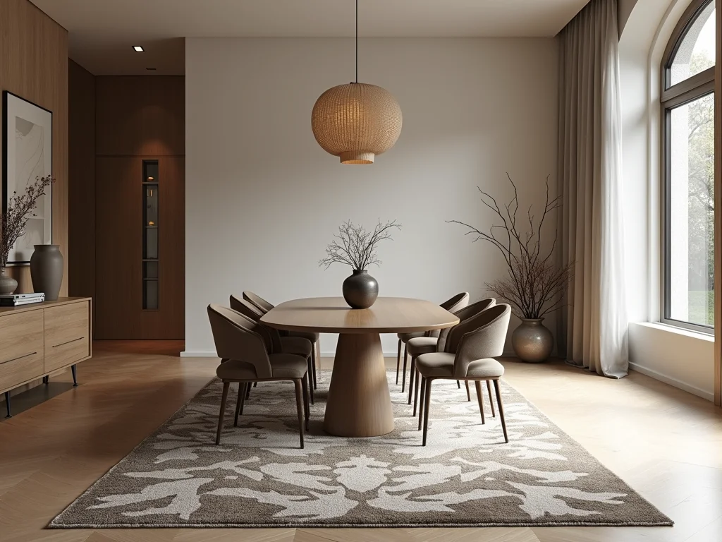 Exemplo de um tapete sisal sintético em formato orgânico, posicionado sob uma mesa de jantar de design escandinavo, com cadeiras de madeira clara.