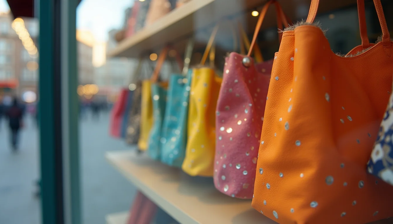 Exposição de bolsas de couro em tons neutros e vibrantes, penduradas em ganchos metálicos em uma vitrine com fundo espelhado, criando sensação de amplitude.